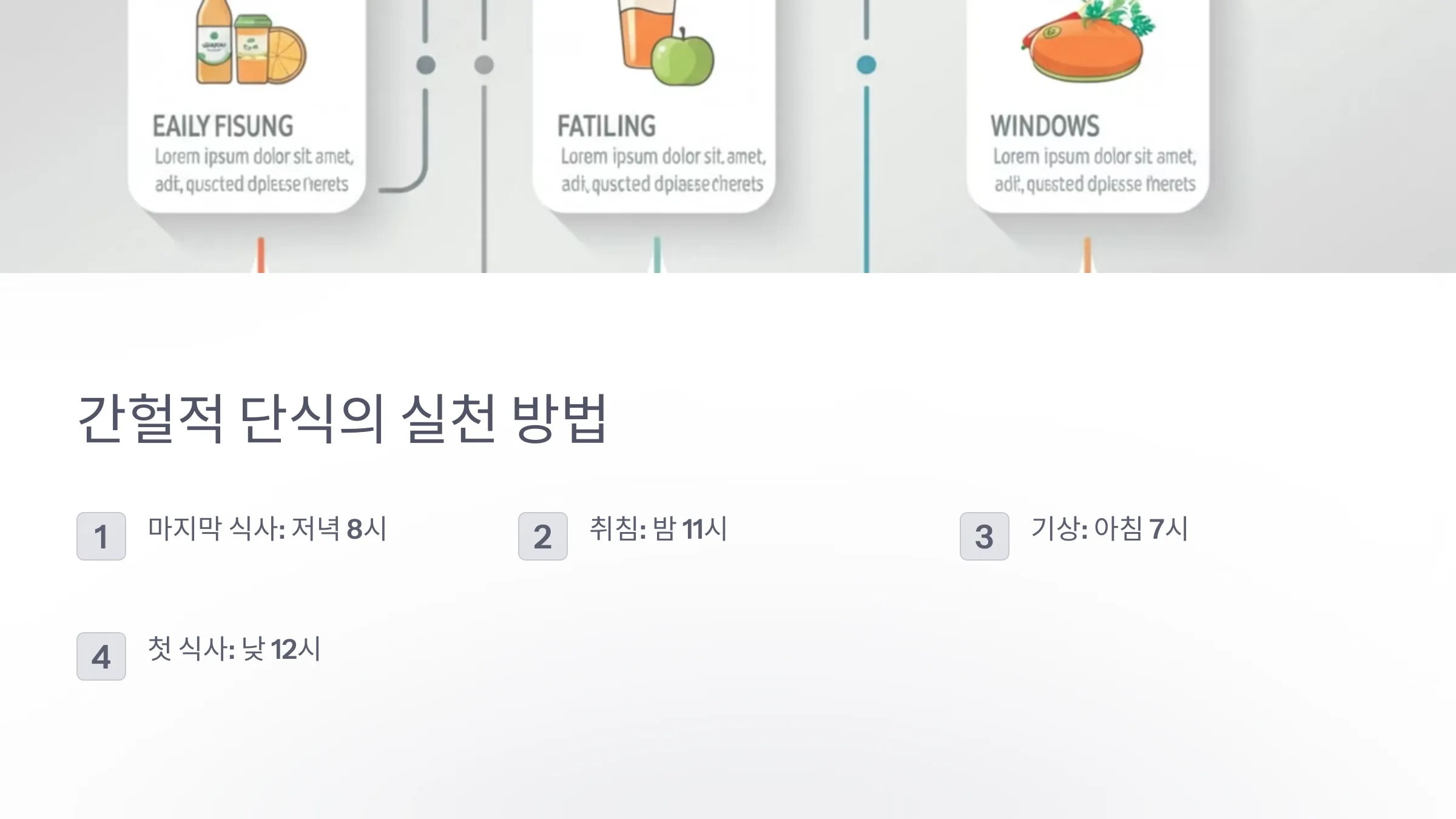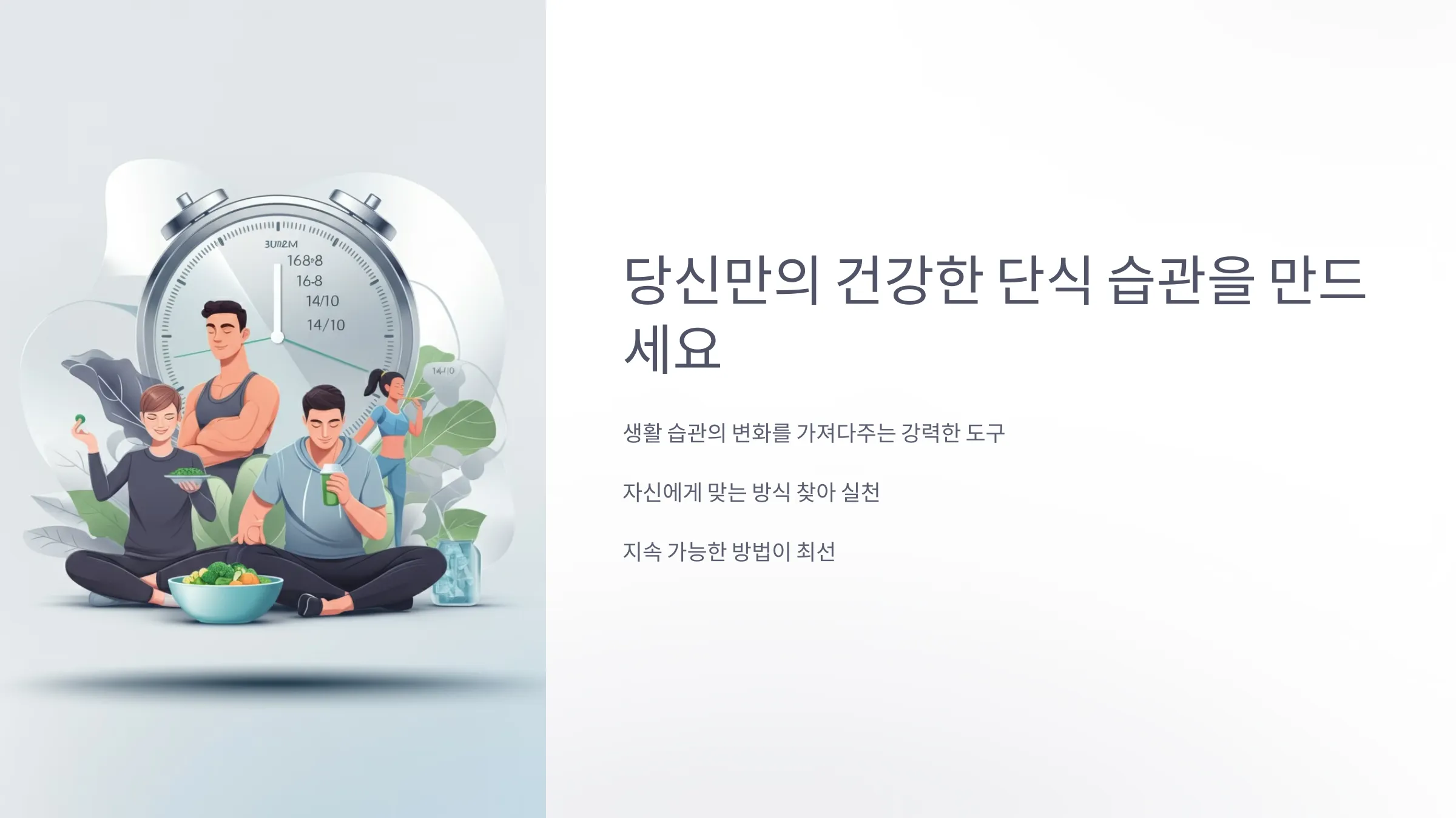 기억하세요. 가장 좋은 단식법은 당신이 지속할 수 있는 방법입니다. 하루아침에 모든 것을 바꾸려 하지 말고, 작은 변화부터 시작해 보세요. 당신의 건강한 변화를 응원합니다.