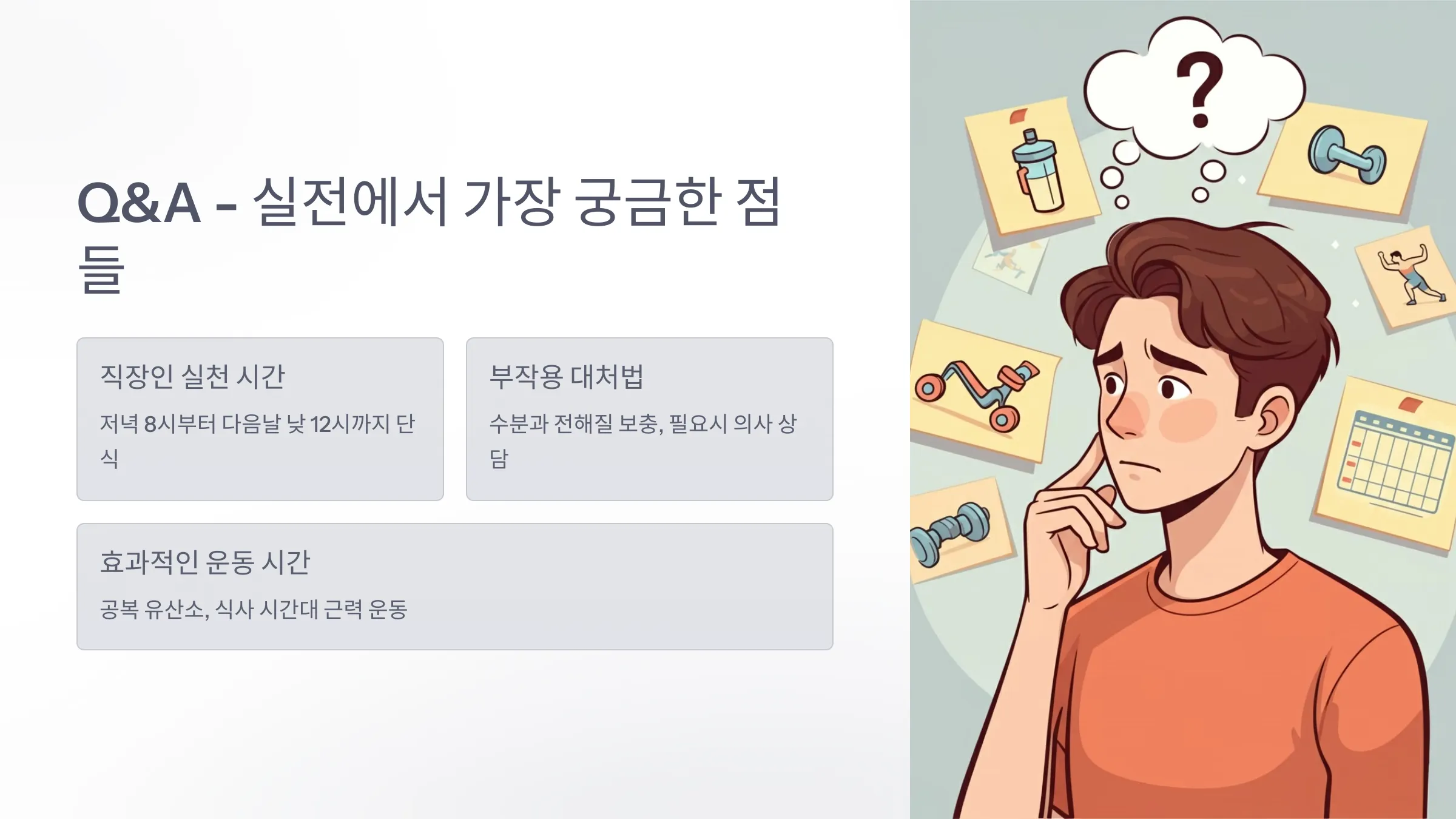 A: 두통, 어지러움, 집중력 저하가 있을 수 있습니다. 충분한 수분 섭취와 전해질 보충으로 대부분 해결됩니다. 심한 경우 단식 시간을 줄이거나 의사와 상담하세요.