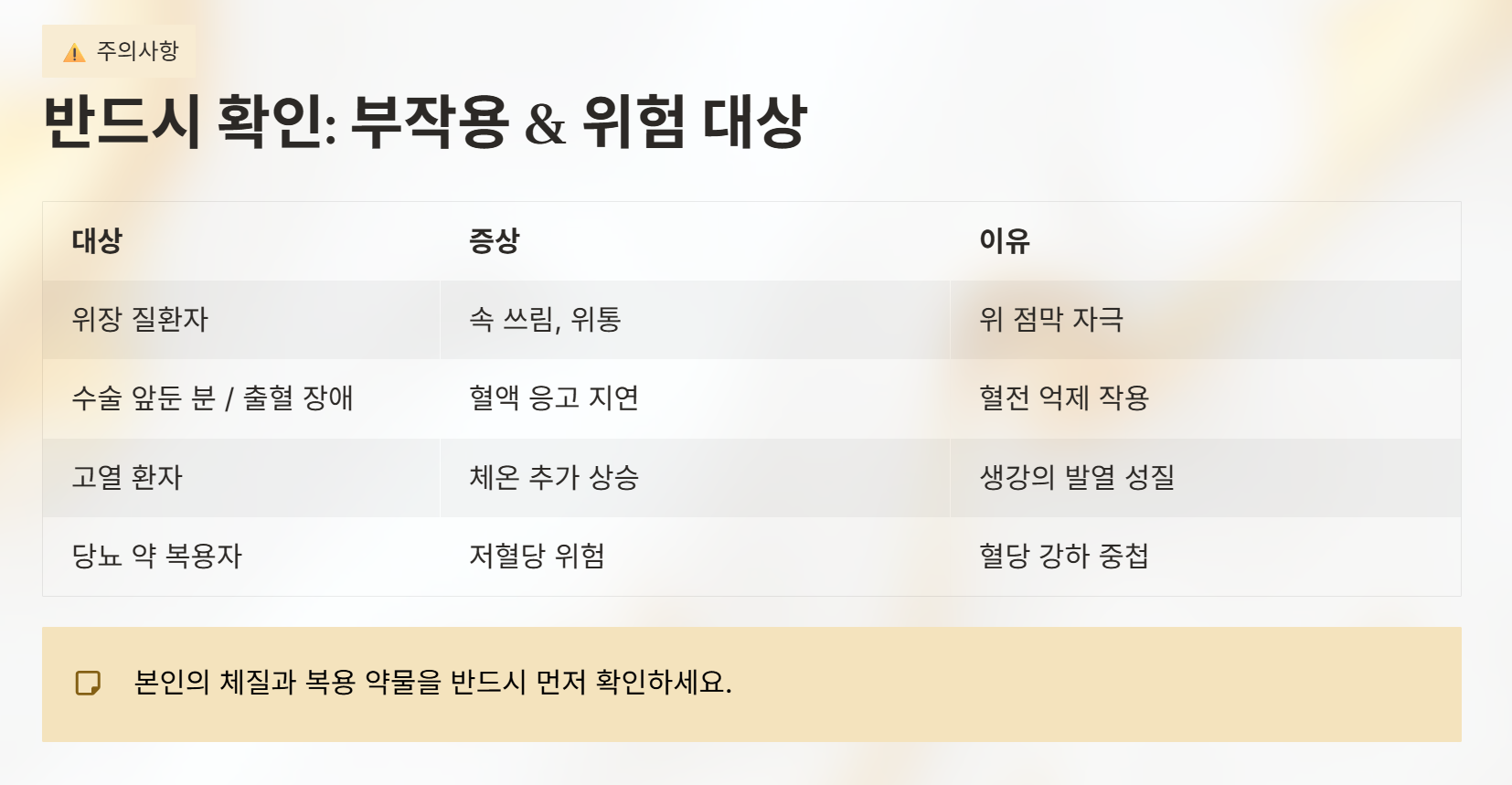 | 당뇨 약 복용자 | 저혈당 위험 | 혈당을 낮추는 약물과 중첩되어 수치가 급격히 낮아질 수 있음 |